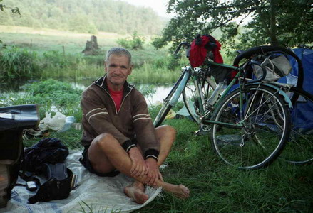 За Киевом на дороге мы остановились перекусить. Подъезжает очень пожилой француз. Шоссейный велосипед, шины или трубки небольшого диаметра. Вместо велобаула, как у меня, с водой 25 кг – две небольшие сумочки в которых, оказывается, есть и палатка. Поздоровались, обнялись и, о чем я сильно жалею, не обменялись адресами, поехали дальше вместе. На ходу изъясняясь на плохом английском, выяснил, что он двигается на велосипеде из Киева. Так мы с ним проехали некоторое время, но, оглянувшись назад, я увидел далеко отставшего напарника и вынуждено сбавил ход. И француз попрощавшись поехал вперед. "Сколько же ему лет?" – подумал я. На вид он значительно старше, чем я.
