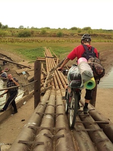 Вообще, искусством ходить в велопоходы я не овладел, иботаккакпотомучто для меня цель "добраться" важнее процесса добирания, а по идее и от него надо получать удовольствие. До сих пор открыт вопрос - какой наиболее оптимальный способ перевозки грузов в отсутствии велоштанов. Попытки закрепить обычный 80 литровый рюкзак к багажнику были смешны - вел был неустойчив, сам рюк обладал лишним весом и не нужной жесткостью. Остановился на спортивной сумке, для вещей которые не надо вынимать в течении езды, и небольшого рюкзачка для того чтобы везти в нем воду, аптечку, атлас и всякую мелочевку. Тем более, что сумка намертво приматывалась к багажнику, и открыть ее было нельзя, а сверху приматывалась пенка, выглядевшая как реактивное сопло, как раз заканчивающееся в районе седла велосипедиста. По сравнению с прошлым велопоходом, когда тушенка в рюкзачище больно била по почкам на ухабах, а котелки надежно сжимали покрышку наподобие работы колодочного тормоза - все было более чем удачно. Я даже подумал что смогу ездить с обычной скоростью )