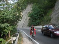 И вот мы снова: едем-едем! Впереди – два перевала. Но они уже не кажутся чем-то сверхъестественным, мозг перестал паниковать перед длительными подъемами, руки просто переключают манетки в положение 1-1, и продолжается движение :) Мы даже как-то пугающе привыкли к окружающим нас пейзажам. Горы, поросшие лесом, извилистые серпантины – не удивляют. А иногда все ловят себя на глюке: кажется, что спуск, и вроде бы велик должен сам катить, а на самом деле – легкий подъем, и педали все равно крутить надо. А бывают и на спуске интересные ситуации - когда дует встречный ветер. Парусность такая, что велосипед останавливается, несмотря на уклон дороги.